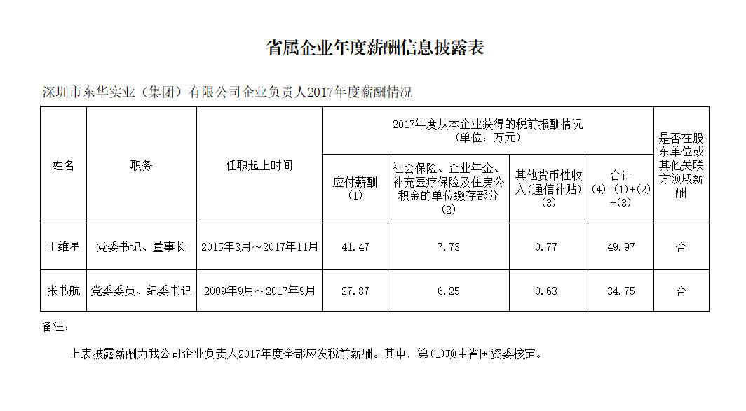 深圳市東華實業(yè)(集團)有限公司2017年度企業(yè)負責人薪酬披露