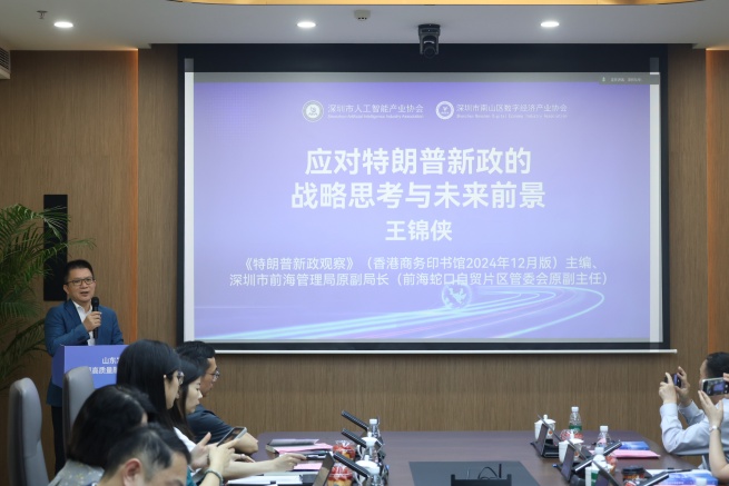 會上,《特朗普新政觀察》(香港商務(wù)印書館2024年12月版)主編、深圳市前海管理局原副局長(前海蛇口自貿(mào)片區(qū)管委會原副主任)王錦俠做主題分享,深入分析了特朗普政府關(guān)稅政策的演變。他表示,面對挑戰(zhàn),中國企業(yè)要堅定信心,聚焦科技創(chuàng)新與產(chǎn)業(yè)升級,推動國內(nèi)國際雙循環(huán),加快多元市場布局和關(guān)鍵技術(shù)自主化,提升全球產(chǎn)業(yè)鏈競爭力。