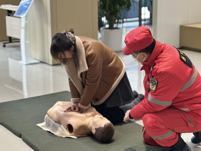 演練結(jié)束后,活動進(jìn)入實操培訓(xùn)環(huán)節(jié)。宋峰站長現(xiàn)場演示心肺復(fù)蘇(CPR)操作流程,從意識判斷、呼救求助,到胸外按壓、人工呼吸,逐一細(xì)致講解并手把手指導(dǎo)參訓(xùn)人員練習(xí)。大家踴躍參與、認(rèn)真揣摩,努力掌握“黃金4分鐘”內(nèi)的急救技能。隨后,參訓(xùn)人員在專業(yè)人員指導(dǎo)下進(jìn)行滅火器實操訓(xùn)練,輪流上陣,精準(zhǔn)撲滅模擬火源,切實提升了撲救初期火災(zāi)的實戰(zhàn)能力。
